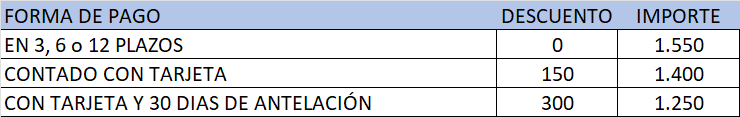 • Se paga el importe total del curso con tarjeta de crédito con el beneficio diferentes descuentos dependiendo de la fecha en la que se pague ( ver tabla arriba)a